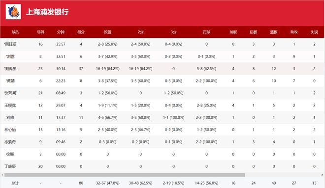 这场比赛上海队这边只有2人得分上双,刘帅拿到11分,刘禹彤30分钟,19中16,罚球8中5,拿到37分12篮板3助攻1盖帽,命中率84.2%,刘禹彤这表现像是打U16亚洲杯的张子宇啊。