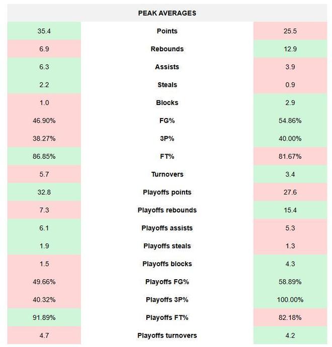 邓肯作为NBA历史上最被低估的球星之一,也在这一次评选中终于获得正名,排名高居第4名,仅次于贾巴尔、詹姆斯与乔丹,也是在这种情况下,美媒通过8项具体数据对比了两名超巨。