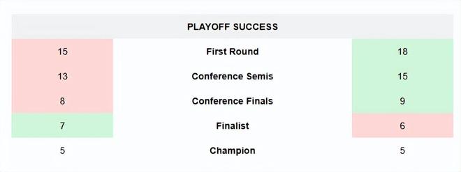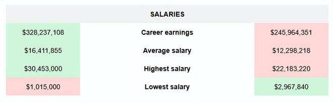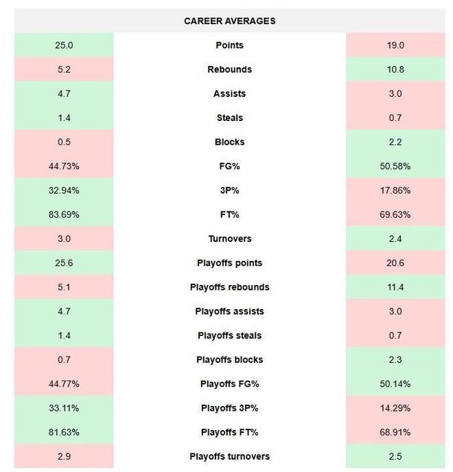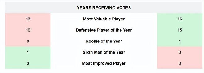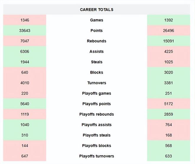 在8项详细的对比中,两队大比分4:4战平,从具体的奖项也不难看出两名风格完全不同的超级巨星都在自己的道路上做到了极致,也都成为各自球队队史上最伟大的球员之一。