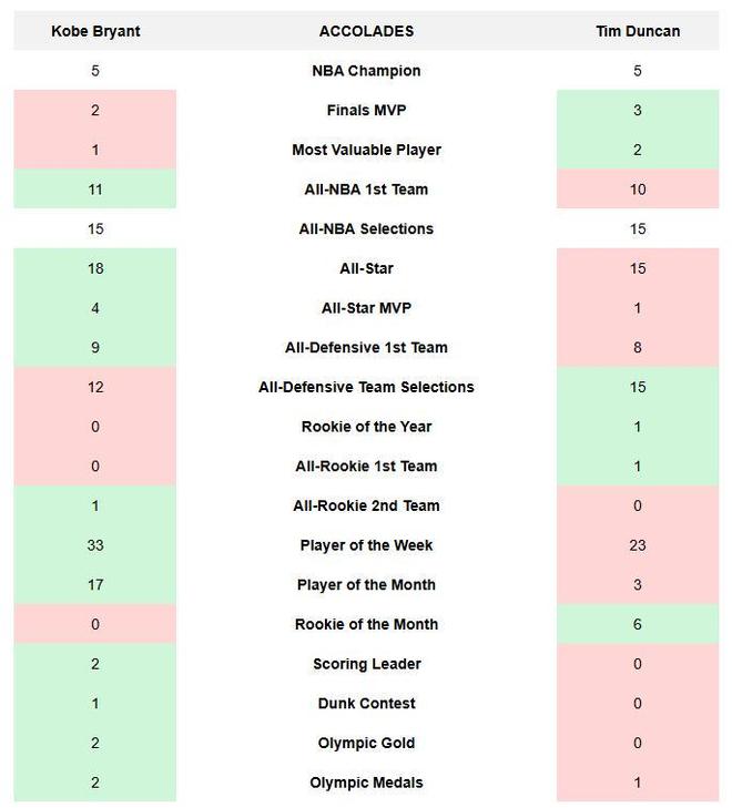 在整体对比伯仲之间的情况下,邓肯之所以获得更高的历史排名,主要是在取得荣誉过程中一些细节上的不同。