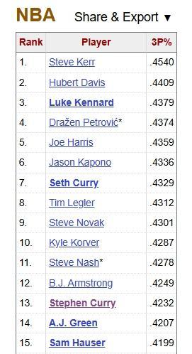 值得一提的是,赛斯-库里的生涯三分命中率为43.29%,排名NBA历史总榜第七,他的哥哥斯蒂芬则是42.32%,排名历史第十三;