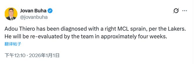 北京时间1月1日,湖人官方表示,新秀前锋阿杜-蒂耶罗被诊断为右膝内侧副韧带扭伤。他将在大约四周后接受队医的复查。这意味着蒂耶罗将至少缺席四周的比赛。目前,湖人的伤病名单上还有八村垒、文森特和里夫斯。