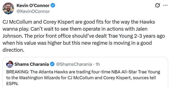 老鹰队在一天前才与奇才队围绕特雷杨与CJ完成1换2交易,将球队原核心特雷杨廉价甩卖,仅换回CJ与基斯珀特。