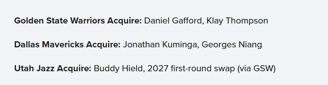 勇士得到:丹尼尔-加福德、克莱-汤普森