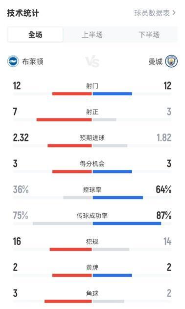 布莱顿21曼城全场数据:射门1212,射正73,控球率36%64%