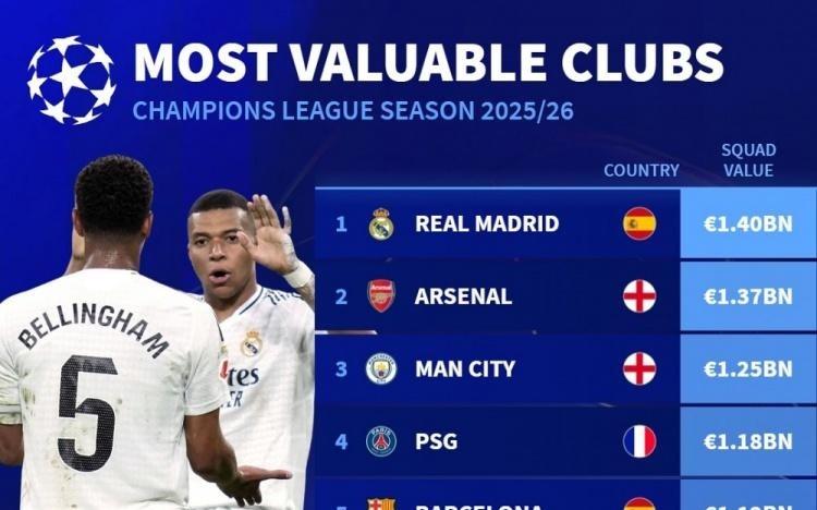 本赛季欧冠球队身价榜:皇马14亿欧居首,阿森纳、曼城、巴黎前四
