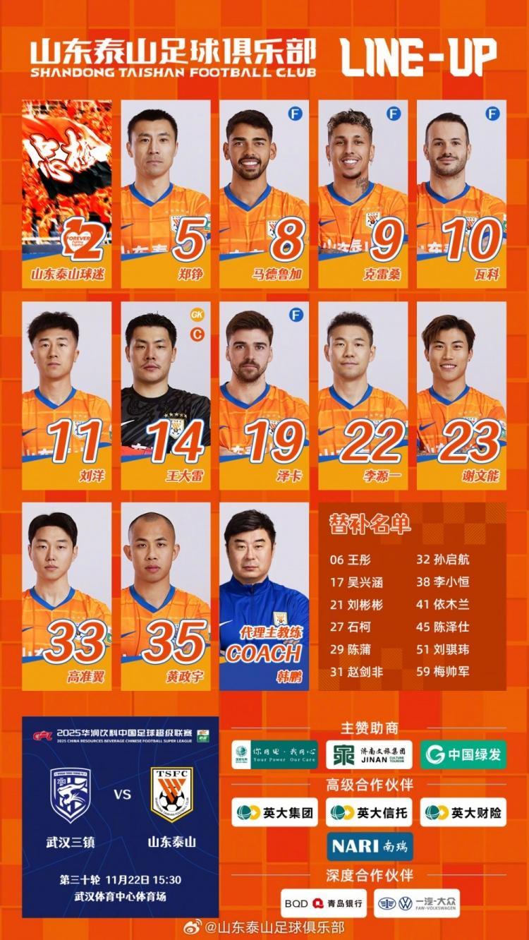 中超泰山对阵武汉首发阵容出炉:泰山全主力上阵助瓦科夺金靴