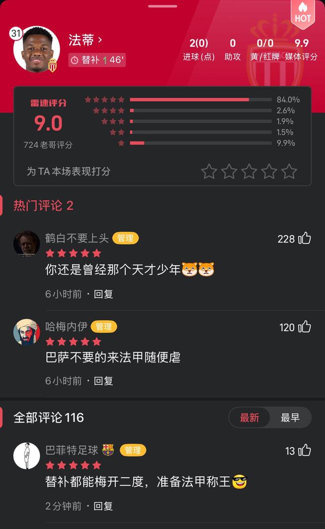 对于法蒂本场比赛的惊艳表现,雷速老哥给出9.0的高分,并在评分中写道,“你还是曾经的那个天才少年。”
