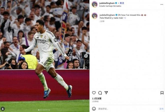 这场胜利的关键,无疑是贝林厄姆的致命一击。赛后,这位进球功臣不仅通过社交媒体晒出庆祝照,配文 “哦我是多么想念这(种感觉)。马德里前进,无需赘言!”,表达了对胜利的渴望和对球队的信心,还在接受采访时分享了内心的激动。