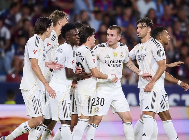 皇马是领头羊,前5轮不仅保持不败金身,还是联盟唯一5连胜的球队,今天客场对阵实力较弱的莱万特,他们扩大了连胜脚步。上半场第28分钟,维尼修斯外脚背弹射破门,有莫德里奇的风采,皇马1-0打破僵局。第38分钟又是维尼修斯在反击中精准大范围转移,马斯坦托诺得球杀入禁区爆射建功,这是他加盟皇马的处子球。