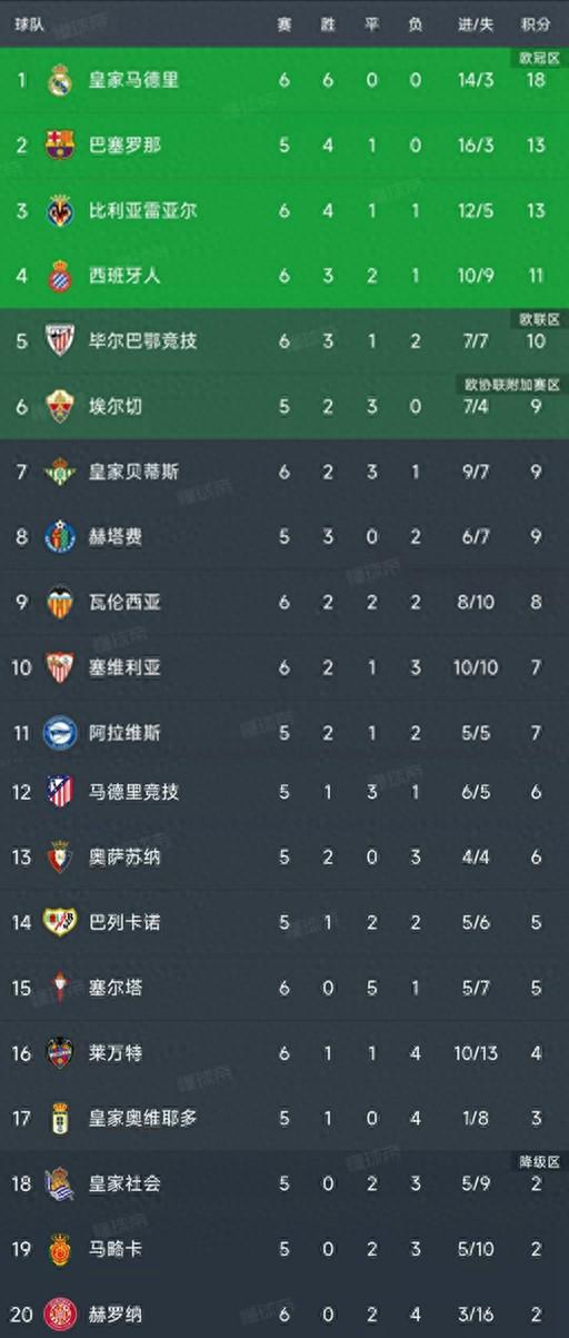 北京时间9月24日,西甲第6轮结束了5场比赛,皇马4-1大胜莱万特,西班牙人2-2瓦伦西亚,比利亚雷亚尔2-1塞维利亚,毕尔巴鄂竞技1-1赫罗纳,皇家贝蒂斯1-1塞尔塔,最新积分榜如下!