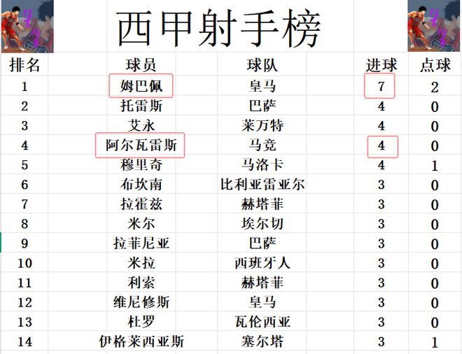 射手榜方面,姆巴佩6轮7球继续领跑,阿尔瓦雷斯今天上演帽子戏法后,追上托雷斯,艾永,穆里奇等人4球并列第2。拉菲尼亚,维尼修斯,杜罗,伊格莱西亚斯等人3球挤入前十。
