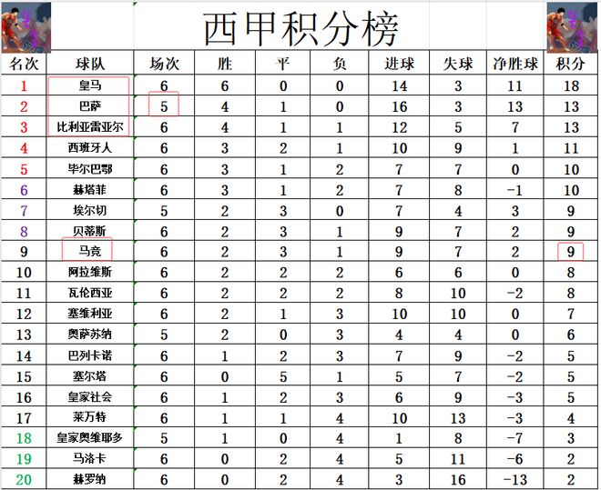 积分榜方面,皇马继续全胜领跑,巴萨少赛一轮落后5分,比利亚雷亚尔净胜球劣势排在巴萨之后。马竞逆转绝杀赢球后,近5轮保持不败,只不过他们平局太多,暂时只是升至第9。