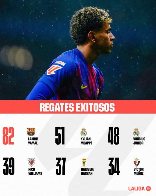 北京时间1月7日,西甲官方晒本赛季成功过人榜:亚马尔高居榜首,姆巴佩位居次席。