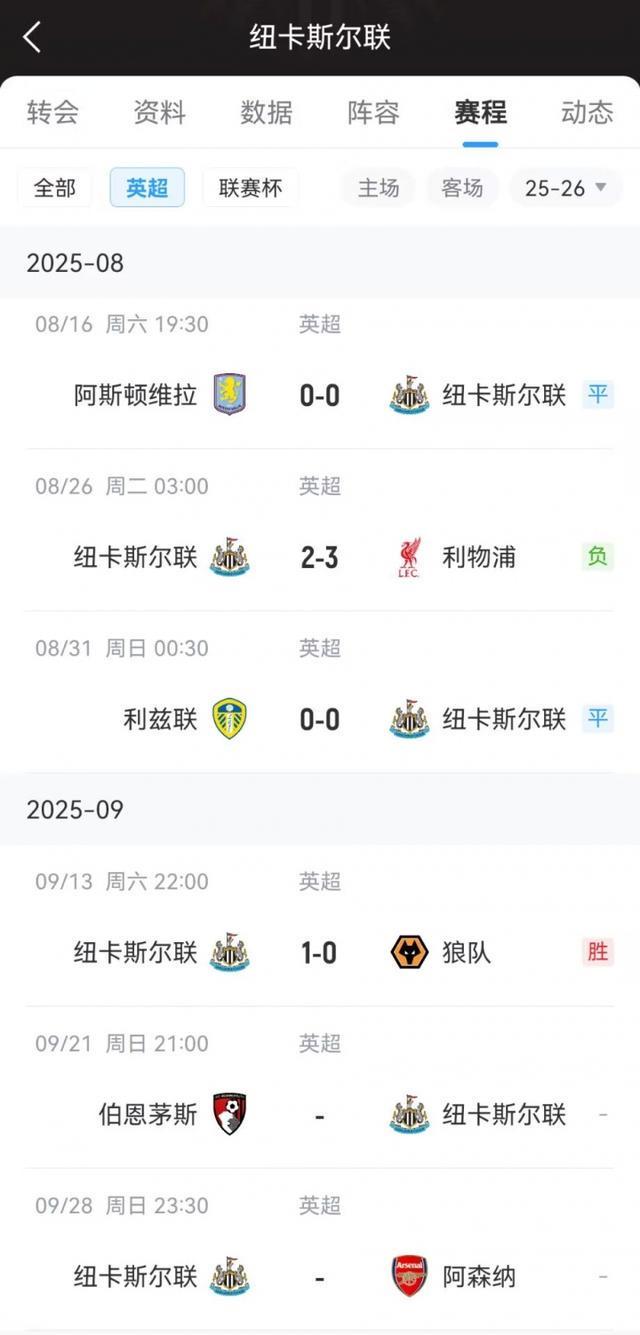 至此,纽卡英超开赛以来5场仅取得1胜(1-0狼队),其余4场联赛吞3平1负。