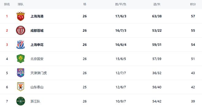 在积分榜上,上海海港的战绩是17胜6平3负,拿到57分排名榜首。第2的是成都蓉城,16胜7平3负,拿到55分。前2的差距只有2分。而联赛只剩下4轮,剩下每场比赛的胜负都将直接影响到最终的冠军归属。显然,现在上海海港已经获得夺冠主动权。上海申花以54分排名第3。北京国安只拿到51分,排名第4。第5的是天津津门虎,拿到43分。山东泰山只拿到42分排名第6。