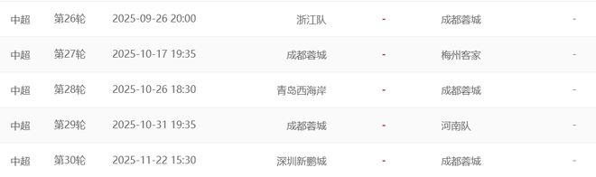 成都蓉城最后五轮联赛将接连面对浙江队(客场)、梅州客家(主场)、青岛西海岸(客场)、河南队(主场)及深圳新鹏城(客场),其中梅州客家、深圳新鹏城均是保级区球队,至于其他三队均是中游球队,赛程难度并不大。值得注意的是,成都蓉城在此期间还有亚冠精英联赛的比赛要踢。