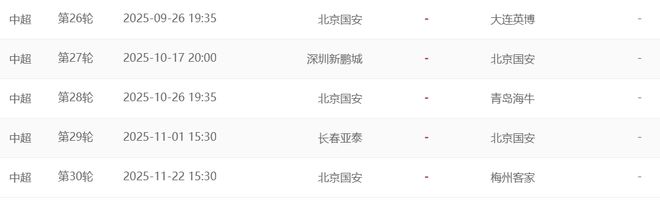 北京国安积分最少,争冠前景最为不乐观。最后五轮,北京国安的联赛对手分别是大连英博(主场)、深圳新鹏城(客场)、青岛海牛(主场)、长春亚泰(客场)、梅州客家(主场),除了大连英博外,其余四队均是保级区球队。在此期间,北京国安则需要征战亚冠二级联赛的比赛。
