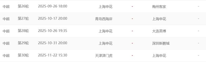 上海申花在积分上落后成都蓉城、上海海港,而这意味着上海申花接下来的容错空间有限。最后五轮联赛,上海申花将分别对战梅州客家(主场)、青岛西海岸(客场)、大连英博(主场)、深圳新鹏城(主场)、天津津门虎(客场),其中梅州客家、深圳新鹏城均是保级区球队,另三队位列中游。当然,申花在此期间同样有亚冠精英联赛的比赛。