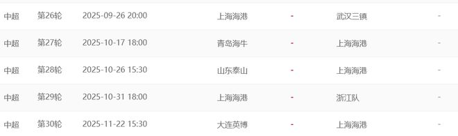 上海海港最后五轮则将先后对战武汉三镇(主场)、青岛海牛(客场)、山东泰山(客场)、浙江队(主场)及大连英博(客场)。对于上海海港而言,奔赴客场挑战山东泰山的难度无需多言。同时,上海海港在此期间也有亚冠精英联赛要踢。