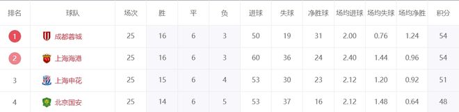 就目前中超联赛积分榜情况来看,成都蓉城(54分)、上海海港(54分)分列前两位,上海申花(51分)排名积分榜第三,至于北京国安(48分)则排名积分榜第四。